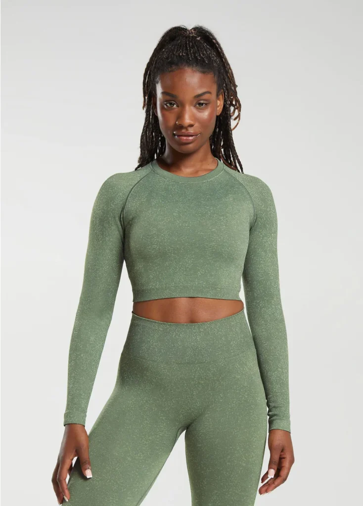 Es una prenda deportiva moderna y elegante diseñada para ofrecer comodidad y soporte durante actividades físicas. Este top está fabricado con una tecnología sin costuras, lo que minimiza las irritaciones en la piel y proporciona un ajuste más suave y flexible. El diseño de manga larga ofrece mayor cobertura y protección, mientras que el corte corto resalta la cintura, brindando un toque estilizado. El patrón Fleck presenta pequeños detalles o puntos dispersos que le dan un toque visual único y dinámico. Ideal para entrenamientos de bajo a medio impacto, este top combina funcionalidad y estilo, permitiendo libertad de movimiento y transpirabilidad.